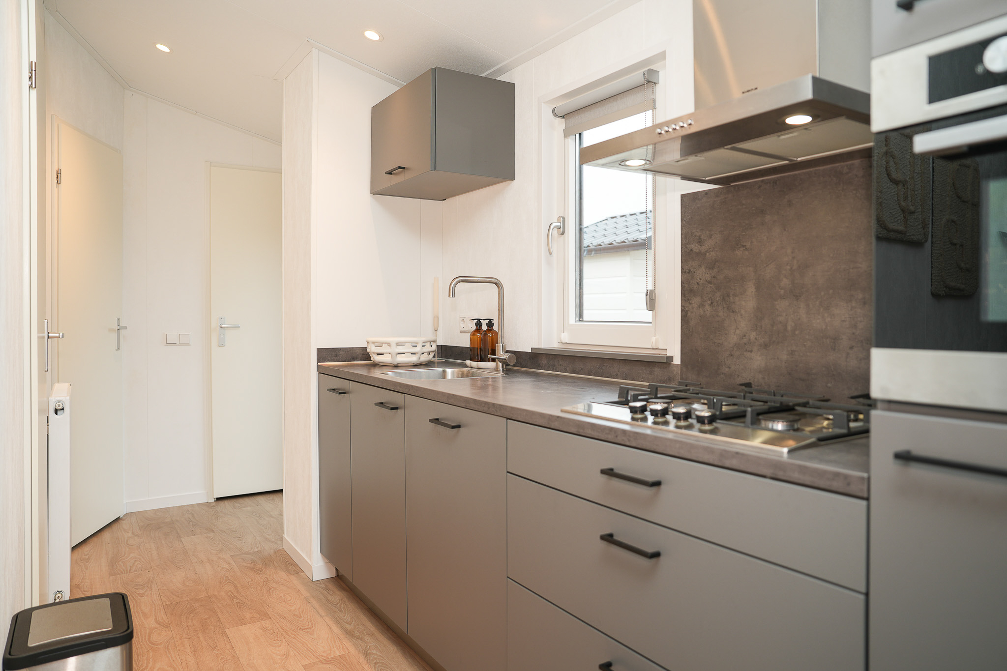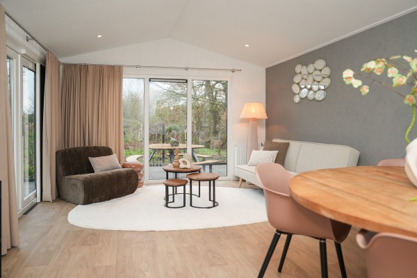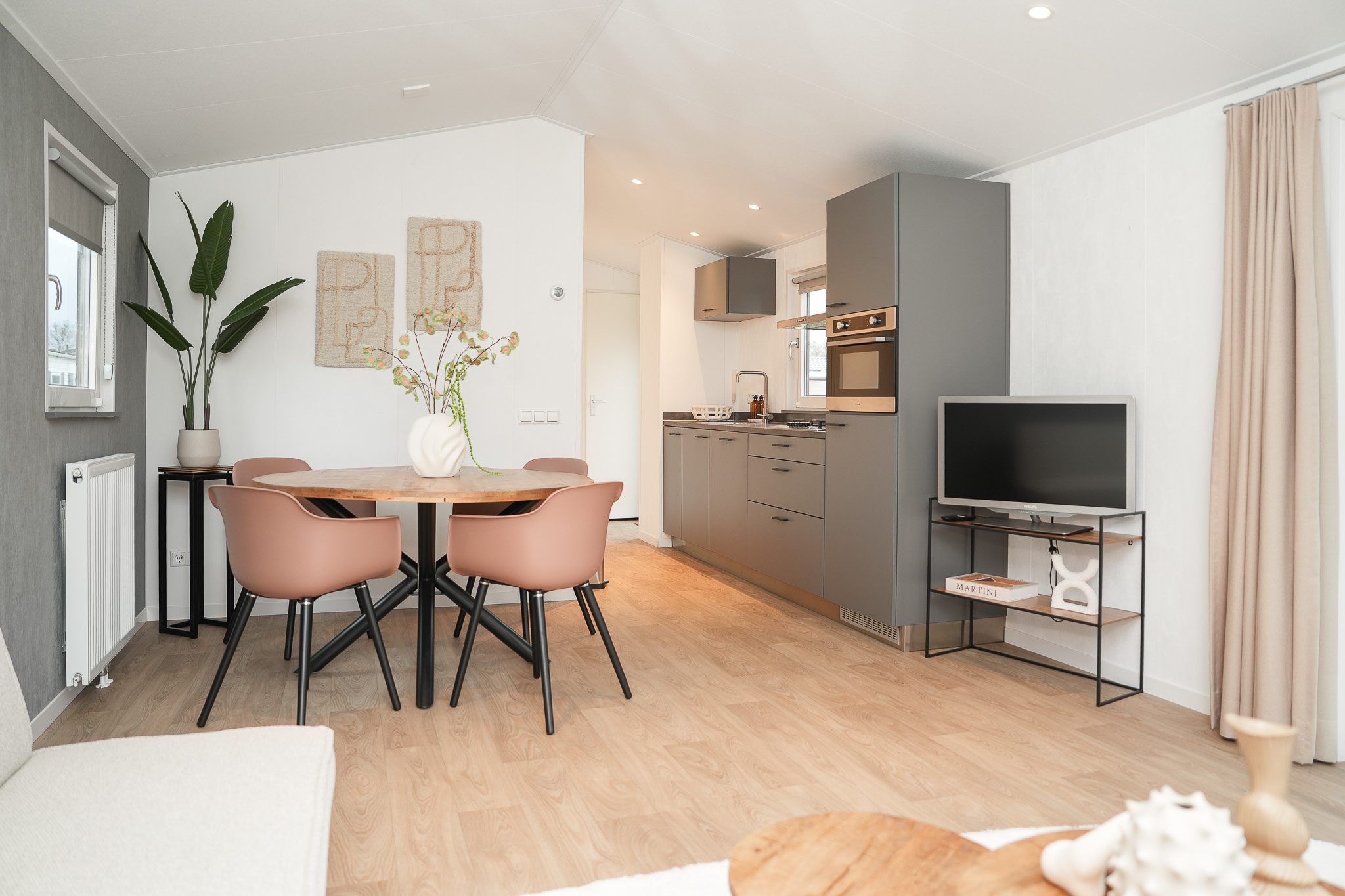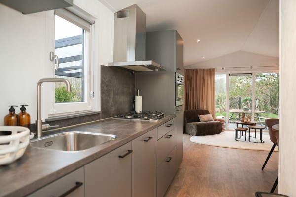 Bij binnenkomst valt direct dat dit chalet in goede conditie verkeert. De keuken is uitgerust met alles wat je nodig hebt: een koelkast met vriesvak, combimagnetron en een vierpits gaskookplaat met afzuigkap. De open woonkamer is sfeervol, met airco en openslaande tuindeuren naar de veranda. Het verticale houtwerk geeft het geheel een luxe, eigentijdse uitstraling.