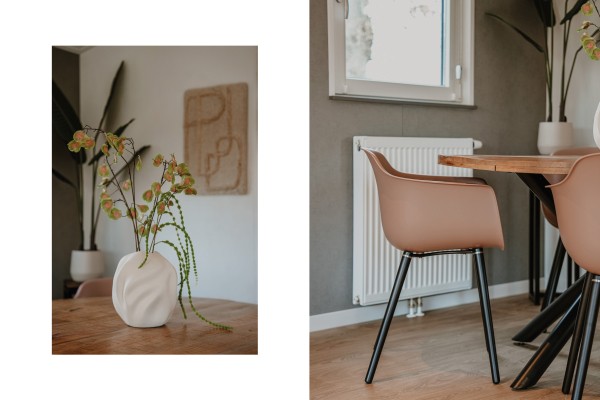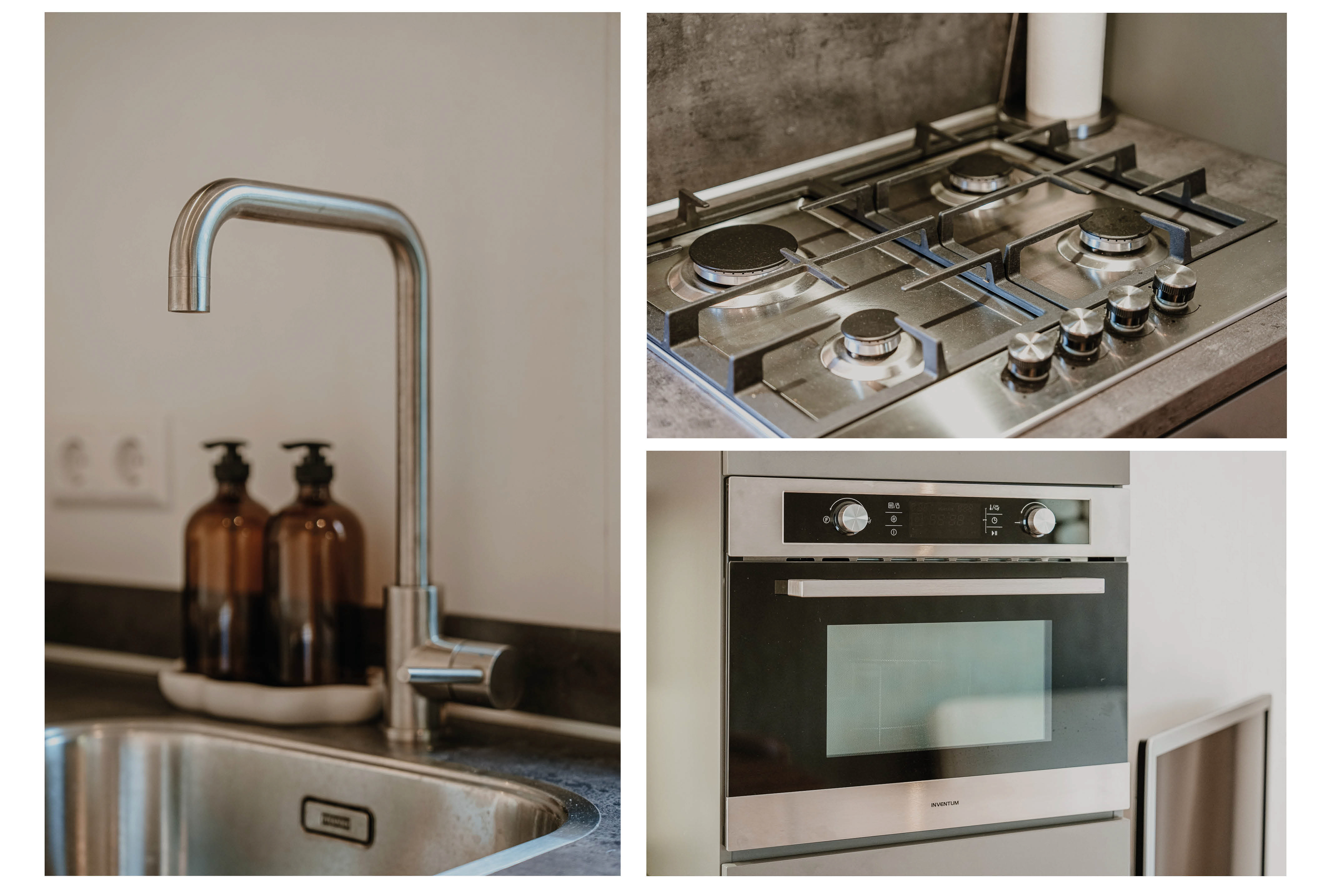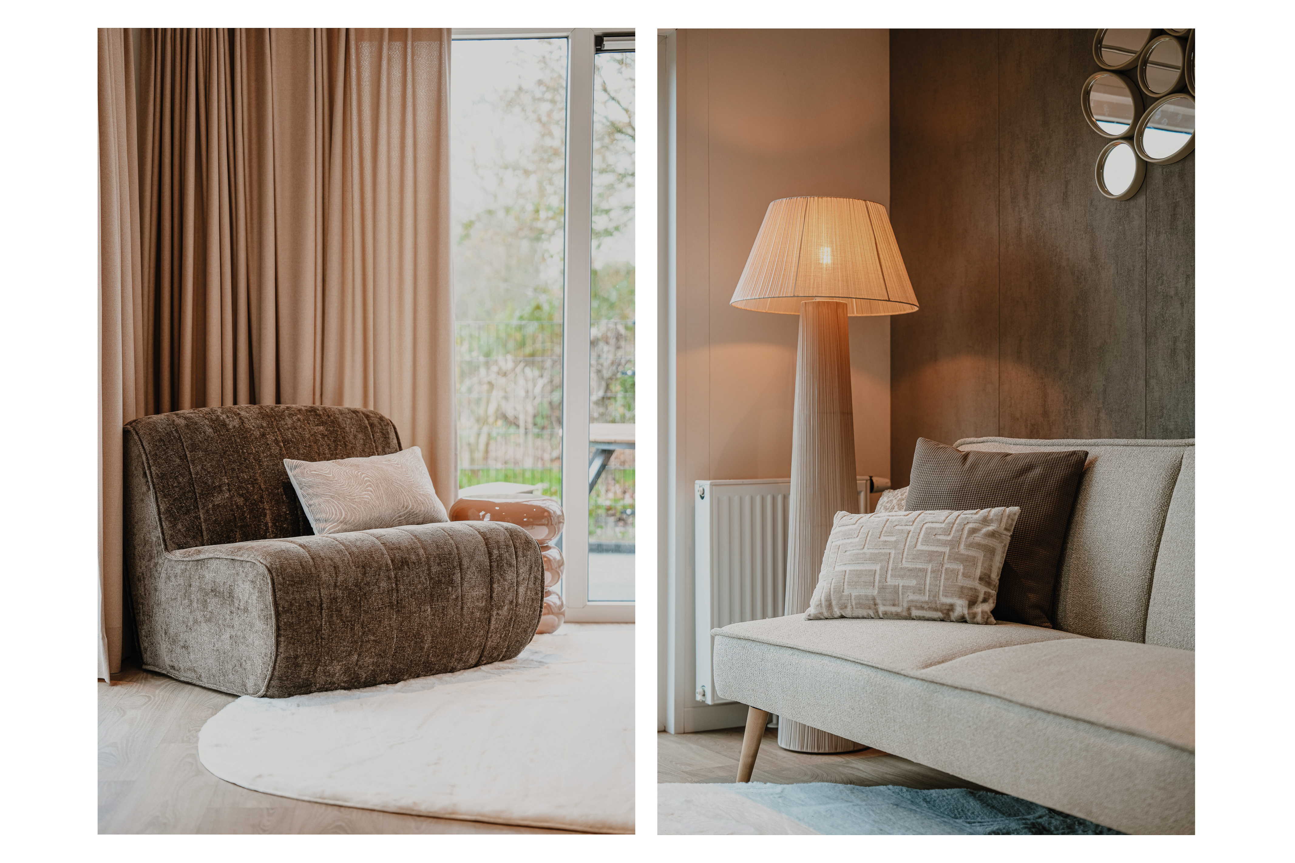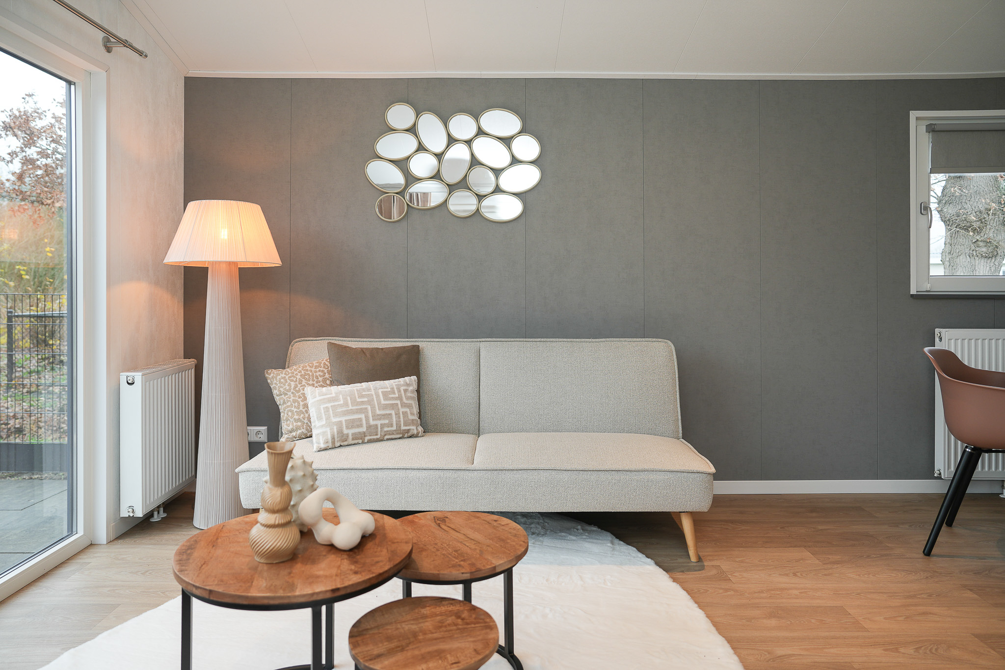 Bij binnenkomst valt direct dat dit chalet in goede conditie verkeert. De keuken is uitgerust met alles wat je nodig hebt: een koelkast met vriesvak, combimagnetron en een vierpits gaskookplaat met afzuigkap. De open woonkamer is sfeervol, met airco en openslaande tuindeuren naar de veranda. Het verticale houtwerk geeft het geheel een luxe, eigentijdse uitstraling.