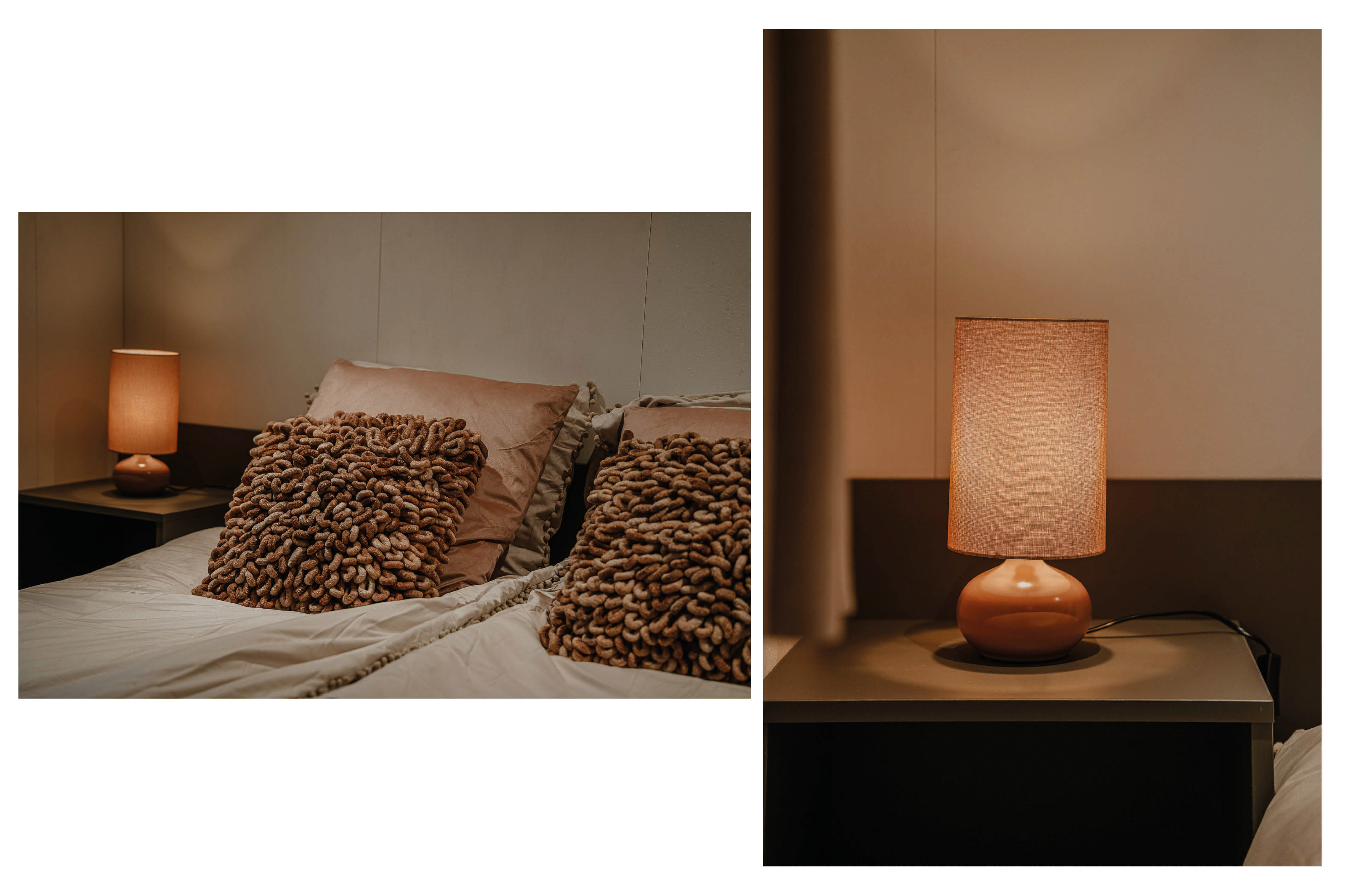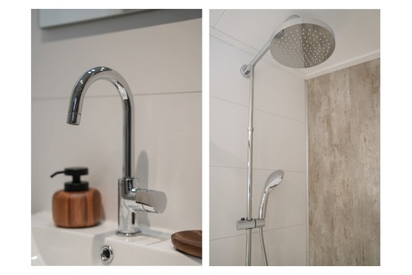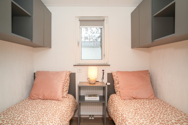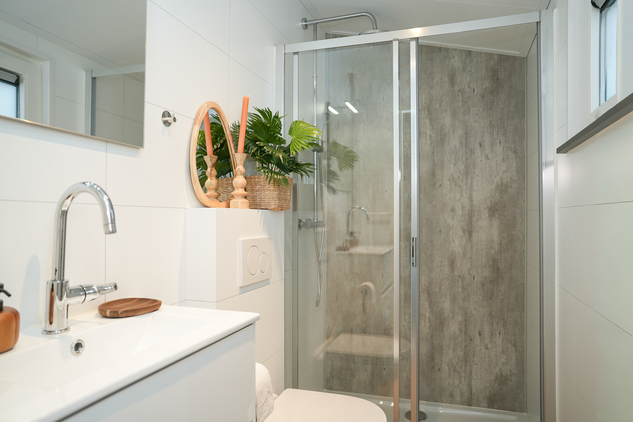 Het chalet beschikt over een ruime slaapkamer met tweepersoonsbed en praktische kastenwand met schuifdeuren. De badkamer is voorzien van een douche met thermostaatkraan, een toilet en een stijlvol badkamermeubel met spiegelkast. De berging met vaste kast geeft voldoende opbergruimte.