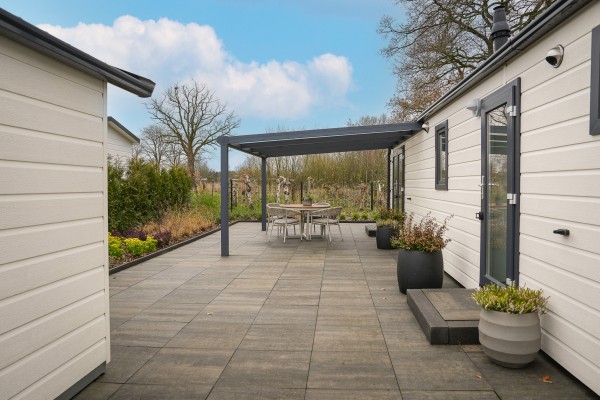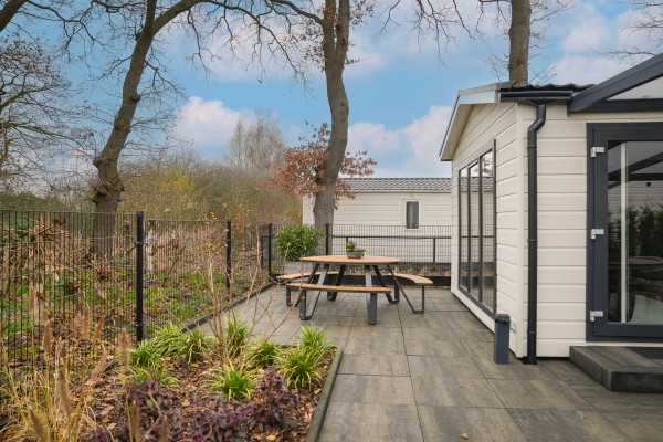 Buiten geniet je van de overdekte veranda met glazen schuifwanden. Ideaal om het hele jaar door buiten te zitten! De tuin is groen met vaste planten en struiken en omheind met een hekwerk. In de houten blokhut vind je niet alleen ruimte voor de wasmachine en droger, maar ook extra bergruimte.