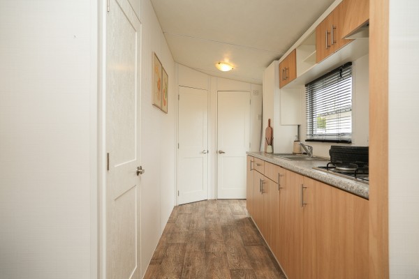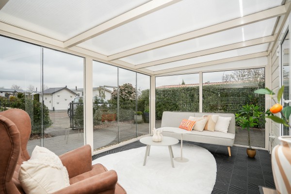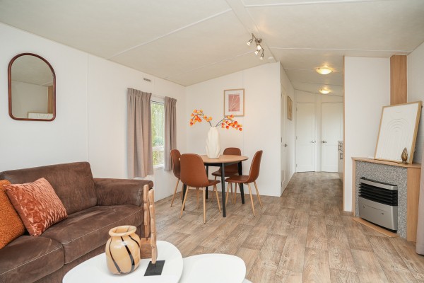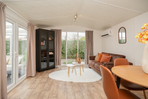 Bij binnenkomst valt direct op hoe netjes en luxe dit chalet is ingericht. De keuken is uitgerust diverse inbouwapparatuur o.a. een koelkast met vriesvak en een vierpits gaskookplaat met afzuigkap. De open woonkamer is sfeervol en voorzien van een airco. Middels de openslaande deuren kom je in de sfeervolle serre. Een fijne lichte ruimte waar je 's-morgens al snel van een bakje koffie kunt genieten.
