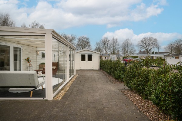 De tuin is opgemaakt uit sierbestrating rondom het chalet en een grasveld. Aan de voorzijde van het chalet staat een mooie houten berging. Het gehele perceel is omheind met een hekwerk en een haag.