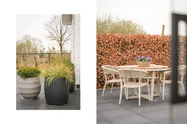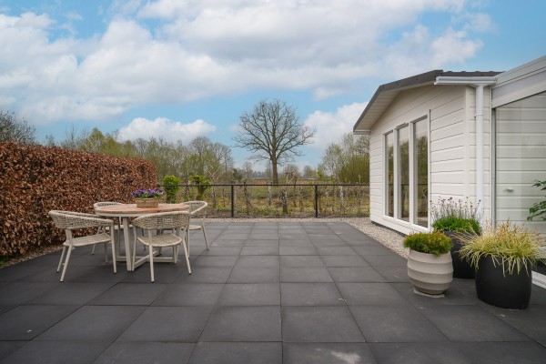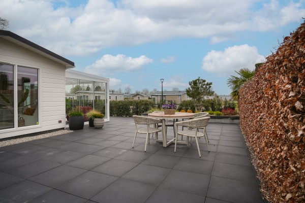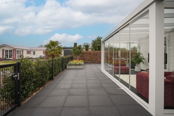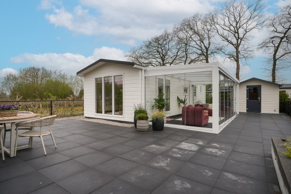 Buiten geniet je ook nog van de overkapping welke aan de serre grenst. De tuin is opgemaakt uit sierbestrating rondom het chalet en mooie tuinbakken met vaste planten. Verder is er nog een mooie houten berging met ruimte voor de wasmachine en droger, maar ook extra bergruimte. Het gehele perceel is omheind met een hekwerk en een hoge haag.