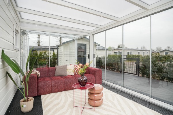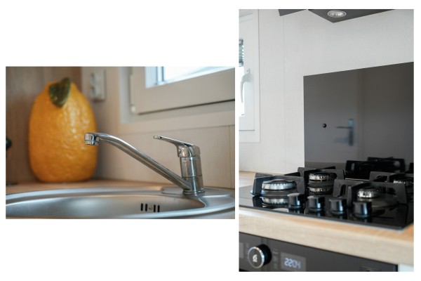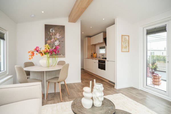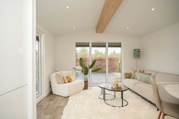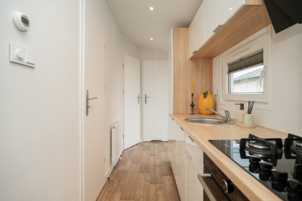 Bij binnenkomst valt direct op hoe netjes en luxe dit chalet is ingericht. De keuken is uitgerust met de nodige inbouwapparatuur o.a. een koelkast met vriesvak, oven en een vierpits gaskookplaat met afzuigkap. De open woonkamer is sfeervol en middels de openslaande deuren kom je in de sfeervolle serre. Een fijne lichte ruimte waar je 's-morgens al snel van een bakje koffie kunt genieten.